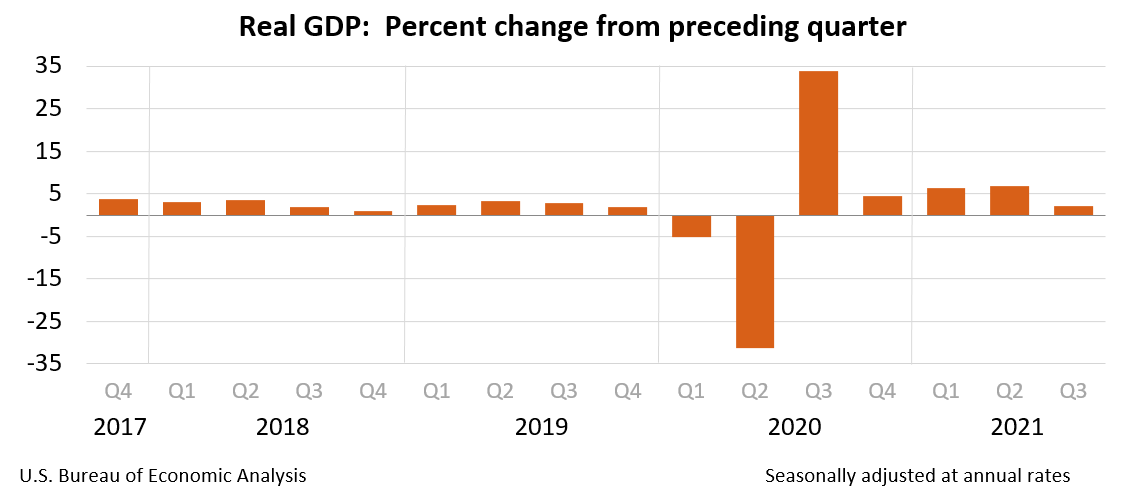 Real gross domestic product (GDP) increased at an annual rate of 2.0 percent in the third quarter of 2021 (table 1), according to the "advance" estimate released by the Bureau of Economic Analysis. In the second quarter, real GDP increased 6.7 percent.