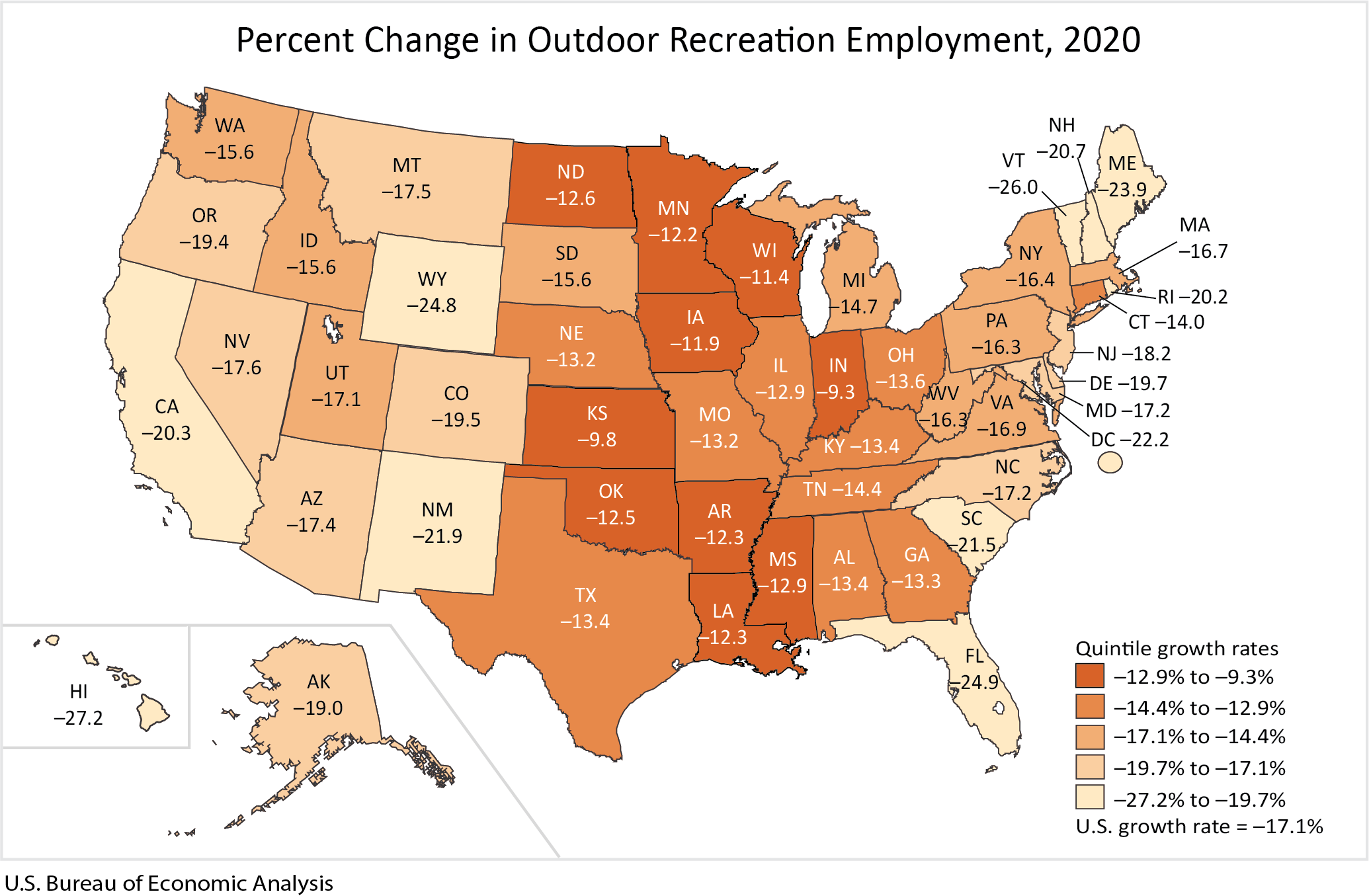 Across all 50 states and the District of Columbia, outdoor recreation employment decreased in 2020, ranging from –9.3 percent in Indiana to –27.2 percent in Hawaii.