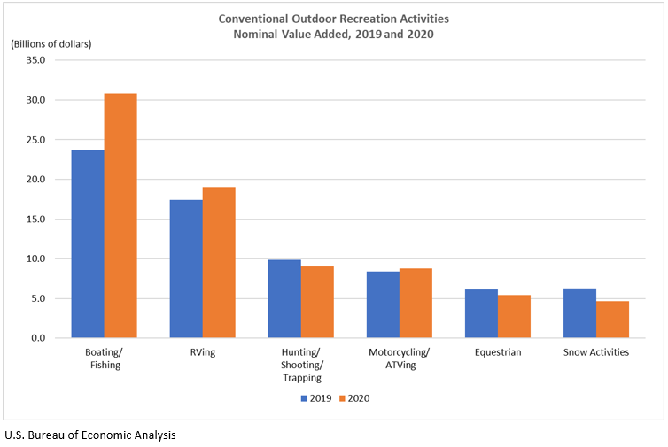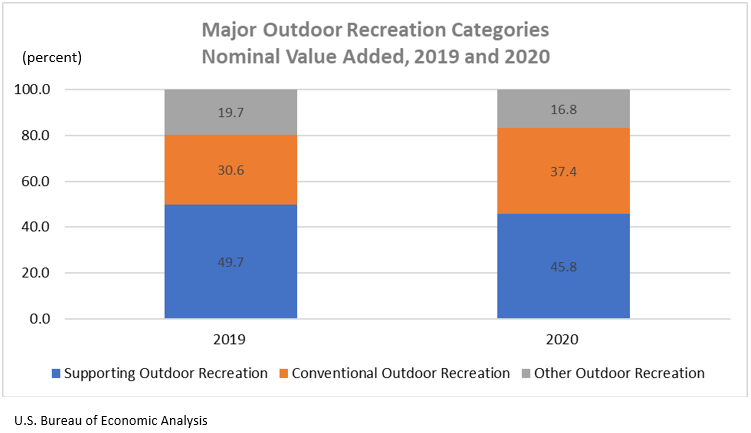 In 2020, conventional outdoor recreation accounted for 37.4 percent of U.S. outdoor recreation value added, compared with 30.6 percent in 2019. The increase was due to higher spending on boating/fishing and RVing. Other outdoor recreation accounted for 16.8 percent of value added in 2020, compared with 19.7 percent in 2019. The decrease was driven by amusement parks/water parks and festivals/sporting events/concerts. Supporting activities accounted for the remaining 45.8 percent of value added in 2020, compared with 49.7 percent in 2019. Supporting activities, particularly travel and tourism-related activities, declined in 2020 during the COVID-19 pandemic as consumers traveled less and reduced spending at hotels and restaurants.