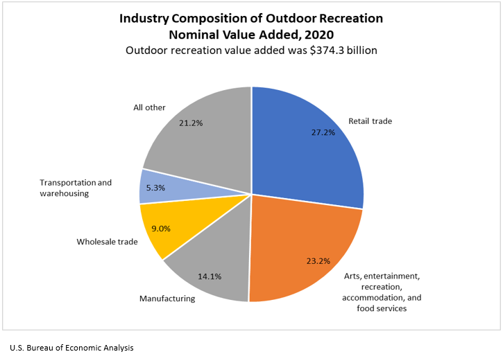 The U.S. Bureau of Economic Analysis (BEA) released statistics today measuring the outdoor recreation economy for the nation, all 50 states, and the District of Columbia. The new U.S. data show that the outdoor recreation economy accounted for 1.8 percent ($374.3 billion) of current-dollar gross domestic product (GDP) for the nation in 2020 (national table 3). At the state level, outdoor recreation value added as a share of state GDP ranged from 4.3 percent in Montana to 1.2 percent in New York and Connecticut. The share was 0.8 percent in the District of Columbia.