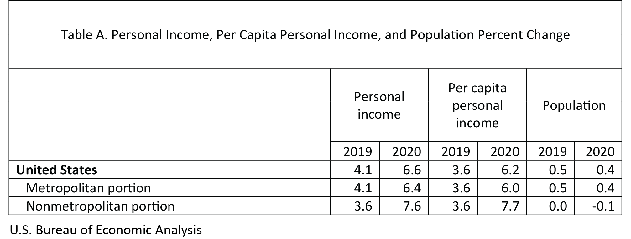 In 2020, personal income increased in 3,040 counties, decreased in 69, and was unchanged in 3, according to estimates released today by the U.S. Bureau of Economic Analysis (BEA). Personal income increased 6.4 percent in the metropolitan portion of the United States and increased 7.6 percent in the nonmetropolitan portion (table A). In metropolitan counties, the percent change in personal income ranged from 24.6 percent in Power County, ID, to –8.9 percent in Lynn County, TX. In nonmetropolitan counties, it ranged from 57.3 percent in Clark County, SD, to –18.9 percent in Skagway Municipality, AK (BEA interactive data).