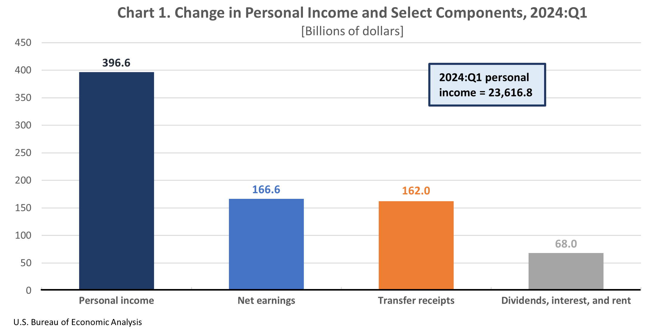In the first quarter of 2024, current-dollar personal income increased $396.6 billion, or 7.0 percent at an annual rate (table 3). Nationally, earnings, transfer receipts, and property income (dividends, interest, and rent), all contributed to the increase in personal income (chart 1).