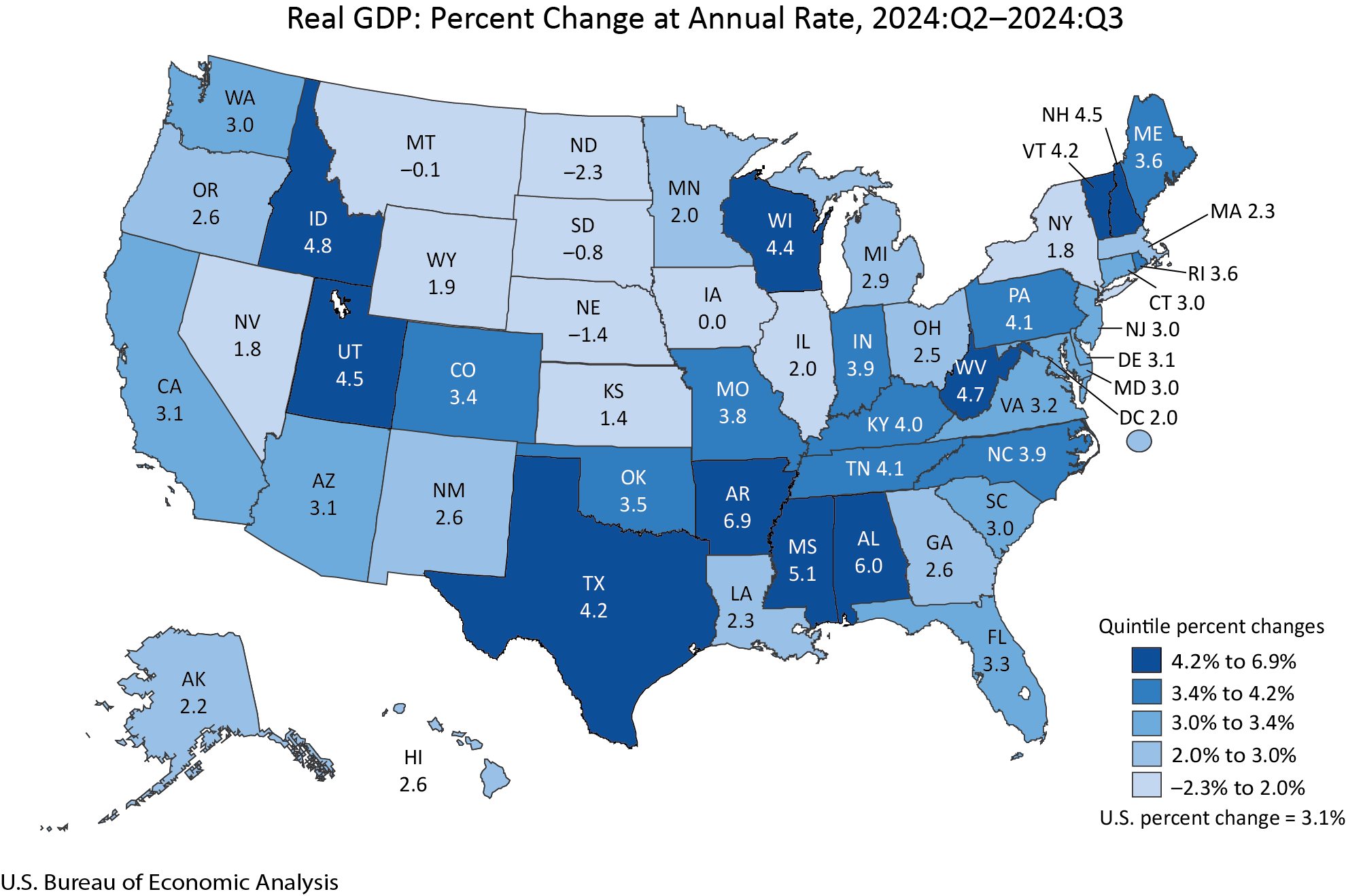 Real gross domestic product increased in 46 states and the District of Columbia in the third quarter of 2024, with the percent change ranging from 6.9 percent at an annual rate in Arkansas to –2.3 percent in North Dakota, according to statistics released today by the U.S. Bureau of Economic Analysis (table 1).