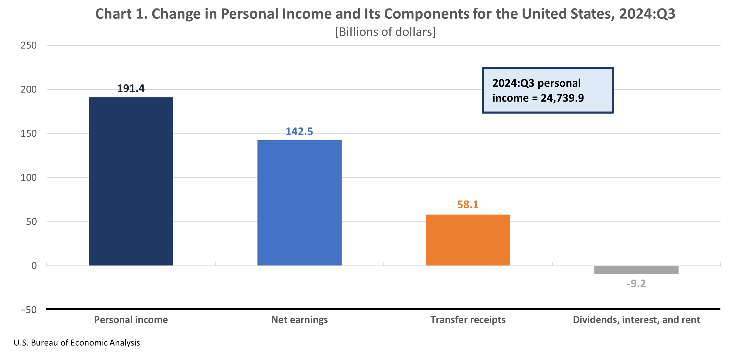 In the third quarter of 2024, current-dollar personal income increased $191.4 billion, or 3.2 percent at an annual rate (table 3). Nationally, increases in earnings and transfer receipts were partially offset by a decrease in property income (dividends, interest, and rent) (chart 1).