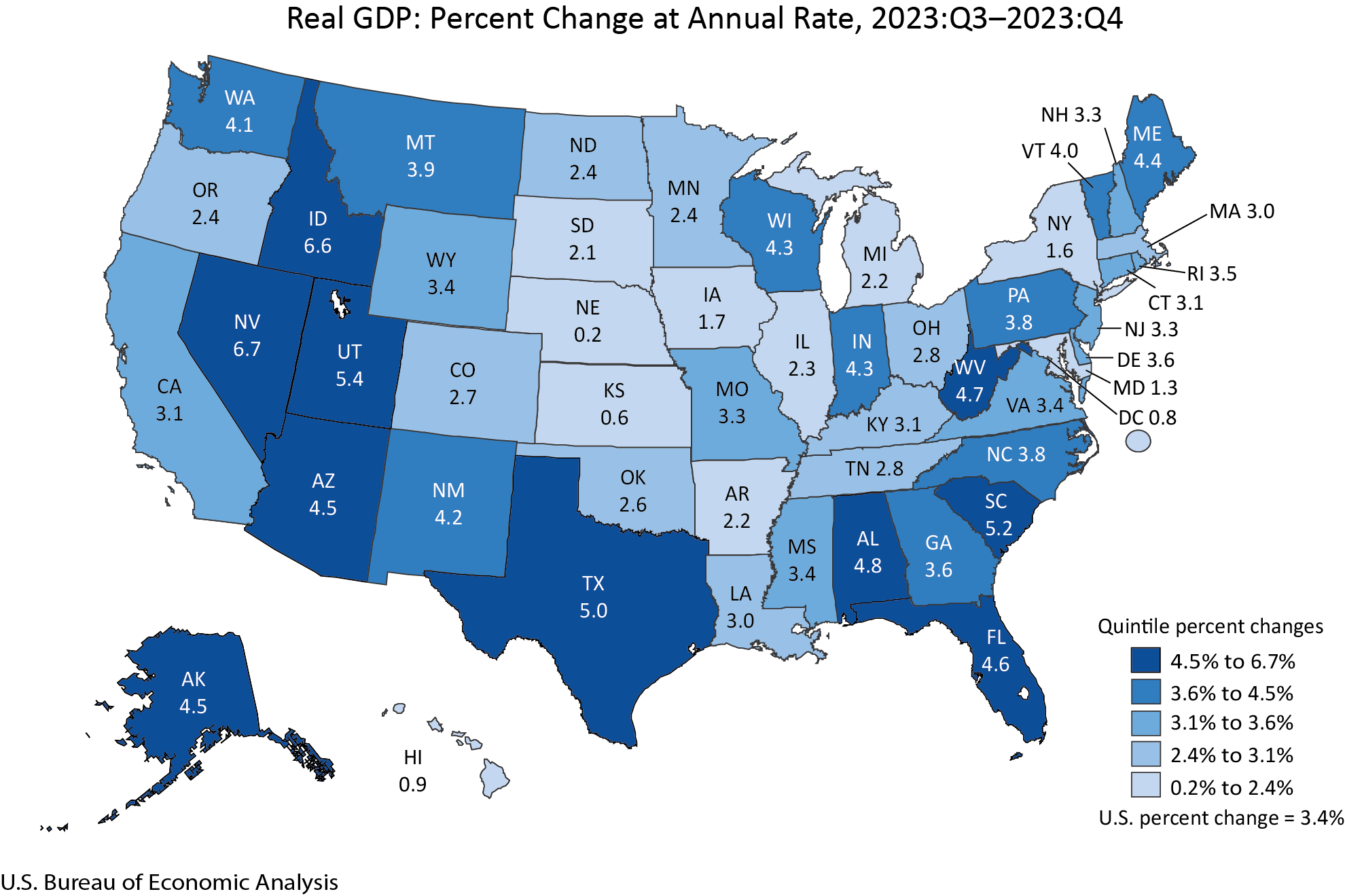 Real gross domestic product (GDP) increased in all 50 states and the District of Columbia in the fourth quarter of 2023, with the percent change ranging from 6.7 percent in Nevada to 0.2 percent in Nebraska (table 1), according to statistics released today by the U.S. Bureau of Economic Analysis (BEA). Current-dollar GDP increased in 49 states and the District of Columbia. For the year 2023, real, or inflation-adjusted, GDP also increased in 49 states and the District of Columbia.