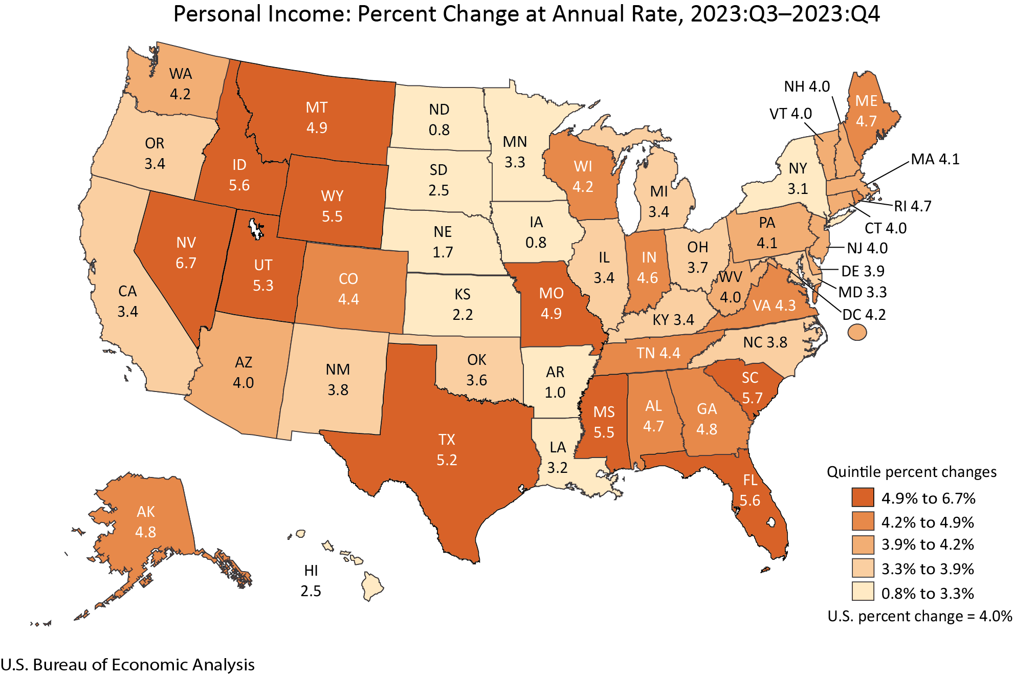 Personal income, in current dollars, increased in all 50 states and the District of Columbia in the fourth quarter of 2023, with the percent change ranging from 6.7 percent in Nevada to 0.8 percent in Iowa and North Dakota (table 4). For the year 2023, current-dollar personal income also increased in all 50 states and the District of Columbia.