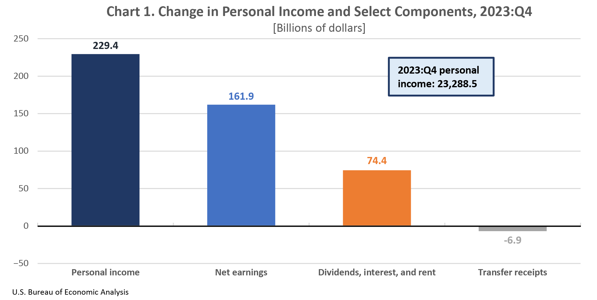 In the fourth quarter of 2023, current-dollar personal income increased $229.4 billion, or 4.0 percent at an annual rate (table 4). Increases in earnings and property income (dividends, interest, and rent) were partially offset by a decrease in transfer receipts (chart 1).