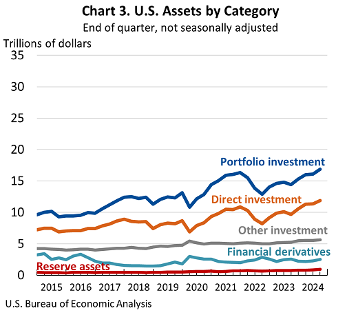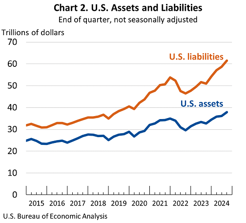 The U.S. net international investment position, the difference between U.S. residents’ foreign financial assets and liabilities, was –$23.60 trillion at the end of the third quarter of 2024, according to statistics released today by the U.S. Bureau of Economic Analysis (chart 1). Assets totaled $37.86 trillion, and liabilities were $61.46 trillion (chart 2). At the end of the second quarter, the net investment position was –$22.55 trillion (revised). The net investment position and components of assets and liabilities are presented in table 1.
