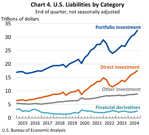 Portfolio investment liabilities increased by $1.59 trillion to $32.49 trillion, attributable to price changes of $1.08 trillion and financial transactions of $637.6 billion. Direct investment liabilities increased by $840.5 billion to $17.54 trillion, reflecting price changes of $733.6 billion (table 2).