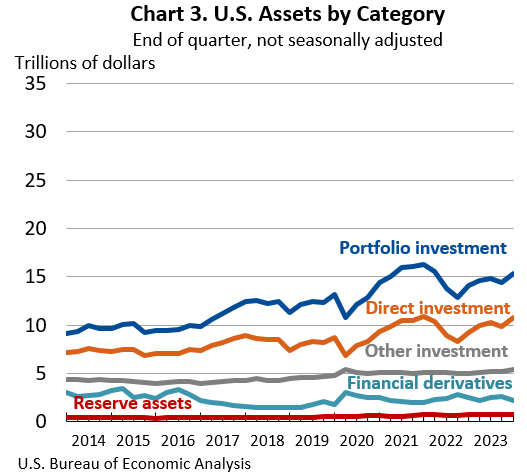 U.S. assets increased by $2.91 trillion to a total of $34.54 trillion at the end of 2023, driven by foreign stock price increases and by financial transactions that mostly reflected increases in direct investment equity assets and in other investment loans. All major investment categories of assets increased, except financial derivatives.