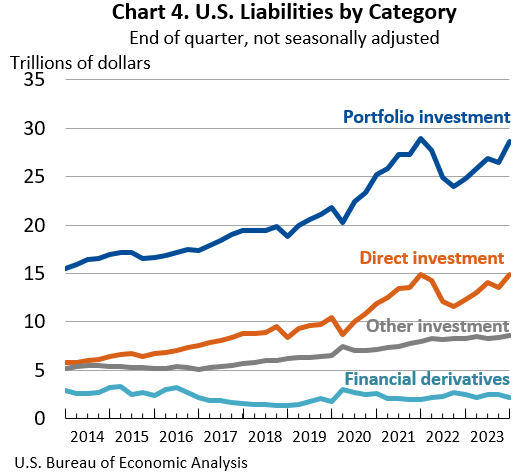 The U.S. net international investment position, the difference between U.S. residents’ foreign financial assets and liabilities, was –$19.77 trillion at the end of the fourth quarter of 2023, according to statistics released today by the U.S. Bureau of Economic Analysis (BEA). Assets totaled $34.54 trillion, and liabilities were $54.31 trillion. At the end of the third quarter, the net investment position was –$18.11 trillion (revised). The net investment position and components of assets and liabilities are presented in table 1 XLSX.
