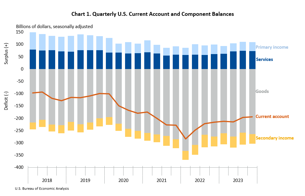 The U.S. current-account deficit, which reflects the combined balances on trade in goods and services and income flows between U.S. residents and residents of other countries, narrowed by $1.6 billion, or 0.8 percent, to $194.8 billion in the fourth quarter of 2023, according to statistics released today by the U.S. Bureau of Economic Analysis (BEA). The revised third-quarter deficit was $196.4 billion.