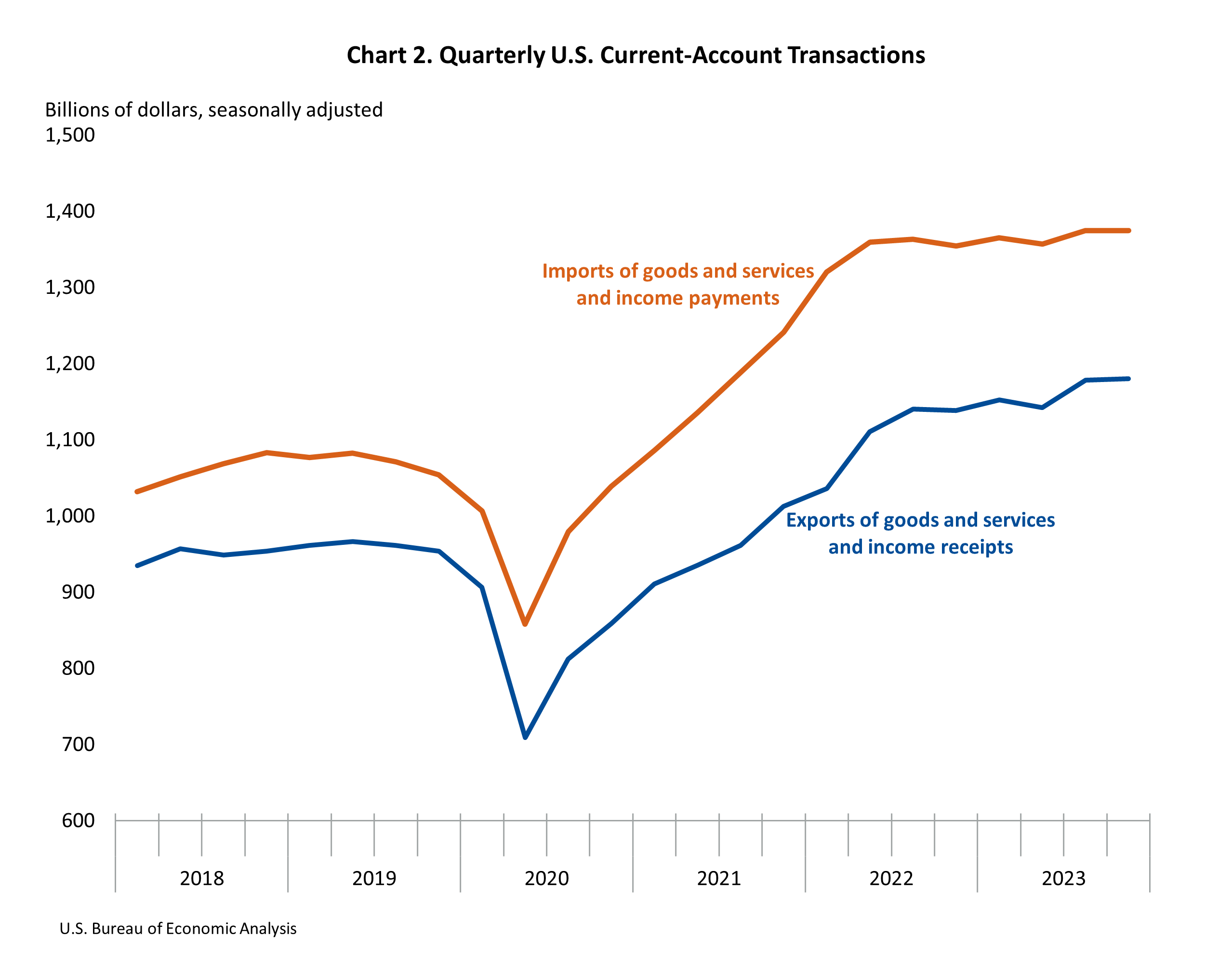 Exports of goods and services to, and income received from, foreign residents increased $228.0 billion to $4.65 trillion in 2023. Imports of goods and services from, and income paid to, foreign residents increased $75.2 billion to $5.47 trillion.