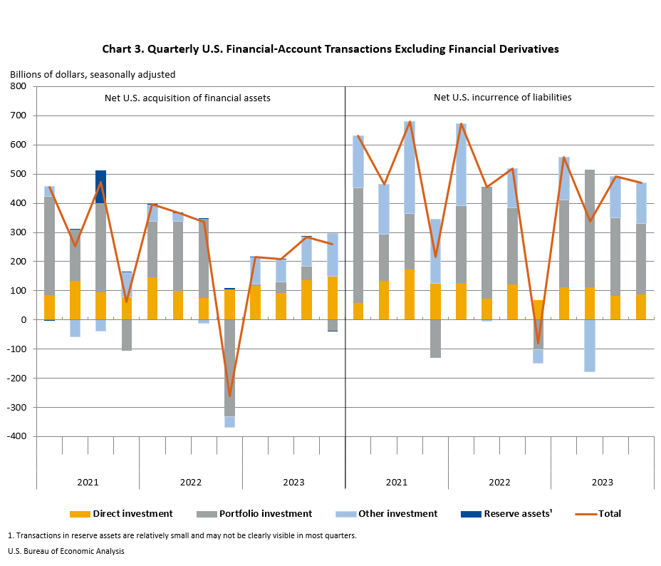 Transactions in 2023 increased U.S. residents’ foreign financial assets by $966.6 billion. Transactions increased direct investment assets, mostly equity, by $494.3 billion; other investment assets, mostly loans, by $415.8 billion; portfolio investment assets, mainly long-term debt securities, by $56.5 billion; and reserve assets by $41 million.2
