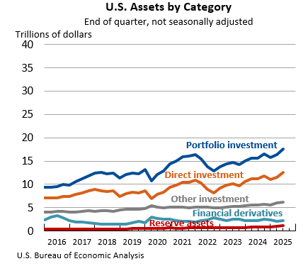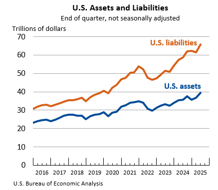 The U.S. net international investment position, the difference between U.S. residents’ foreign financial assets and liabilities, was –$26.14 trillion at the end of the second quarter of 2025, according to statistics released today by the U.S. Bureau of Economic Analysis. Assets totaled $39.56 trillion, and liabilities were $65.71 trillion. At the end of the first quarter, the net investment position was –$24.65 trillion (revised). The net investment position and components of assets and liabilities are presented in table 1.