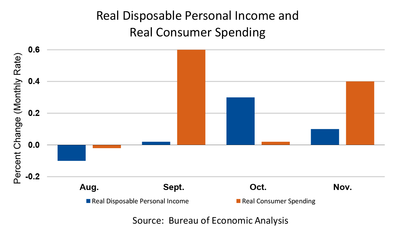 Real consumer spending (PCE), spending adjusted for price changes, increased 0.4 percent in November after no change in October. Spending on durable goods increased 0.2 percent in November, the same increase as in October.