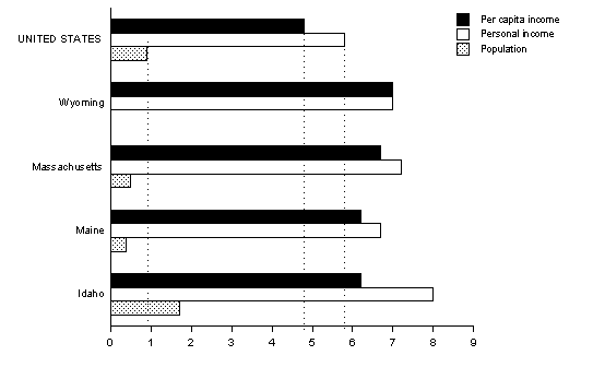 Two western states Wyoming and Idaho and two eastern states Massachusetts and Maine had the fastest growth in per capita personal income in the nation in 1999, according to preliminary estimates released by the Commerce Department's Bureau of Economic Analysis. This release also introduces the comprehensive revision of the state personal income estimates for 1969-99 (see Comprehensive revision of state personal income estimates on page 6 of this release for more details).