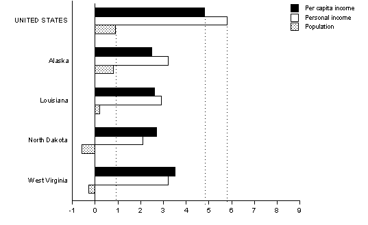In all four slowest growing states, personal income grew at below the U.S. average of 5.8 percent, and population either declined or grew at below the U.S. average of 0.9 percent.