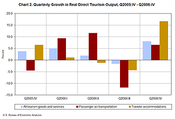 Real direct tourism output grew at an annual rate of 8.0 percent in the fourth quarter of 2006 reflecting a rebound in the output growth of traveler accommodations and passenger air transportation, according to data released today by the U.S. Bureau of Economic Analysis. In the third quarter, real tourism declined 1.6 percent (revised). By comparison, real gross domestic product (GDP) grew at an annual rate of 2.2 percent (preliminary) in the fourth quarter and 2.0 percent (final) in third quarter 2006.