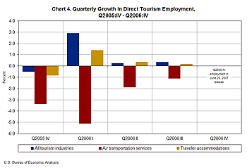 Direct tourism employment rose 0.3 percent in the third quarter of 2006 (the most recent period for which data are available), after growing 0.3 percent (revised) in the second quarter of 2006. By comparison, overall U.S. employment grew 1.6 percent in the third quarter of 2006, and 1.5 percent (revised) in the second quarter of 2006.
