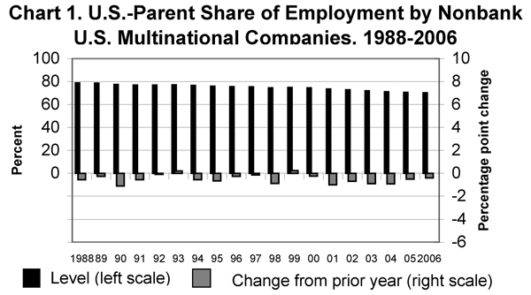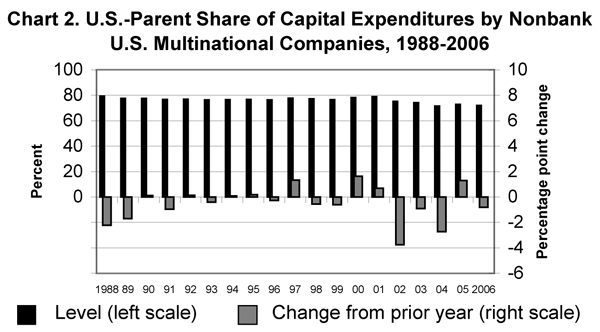 Employment in the United States by U.S. parent companies accounted for 70 percent of the worldwide employment of U.S. MNCs in 2006, down from 71 percent in 2005. The U.S.-parent share of the worldwide capital expenditures of U.S. MNCs in 2006 was 72 percent, down from 73 percent in 2005.