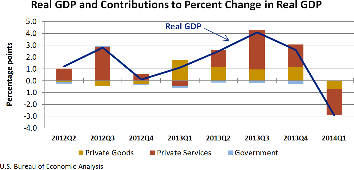Real gross domestic product (GDP) decreased at an annual rate of 2.9 percent in the first quarter of 2014 after increasing 2.6 percent in the fourth quarter of 2013. Both private services- and goods-producing industries contributed to the decrease, while the government sector increased slightly. Durable-goods manufacturing; wholesale trade; and agriculture, forestry, fishing, and hunting were the leading contributors to the decrease in GDP. Overall, 16 of 22 industry groups contributed to the 2.9 percent decrease in U.S. economic activity.