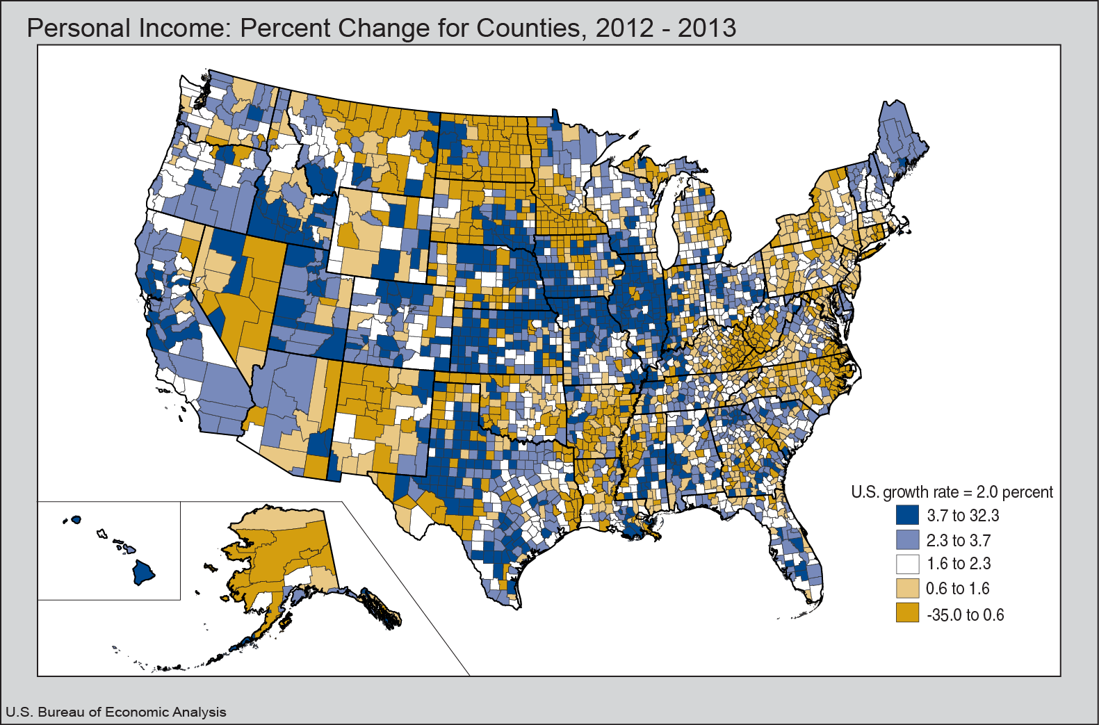 Personal income grew in 2013 in 2,695 counties, fell in 390, and was unchanged in 28, according to estimates released today by the U.S. Bureau of Economic Analysis. On average, personal income rose 2.0 percent in 2013 in the metropolitan portion of the United States and rose 2.1 percent in the nonmetropolitan portion. The metropolitan and nonmetropolitan portions grew 5.3 percent and 4.4 percent, respectively, in 2012. The percent change from 2012 to 2013 in personal income ranged from -35.0 percent in LaMoure County, North Dakota to 32.3 percent in Greeley County, Kansas. Inflation, as measured by the national price index for personal consumption expenditures, slowed to 1.2 percent in 2013 from 1.8 percent in 2012.
