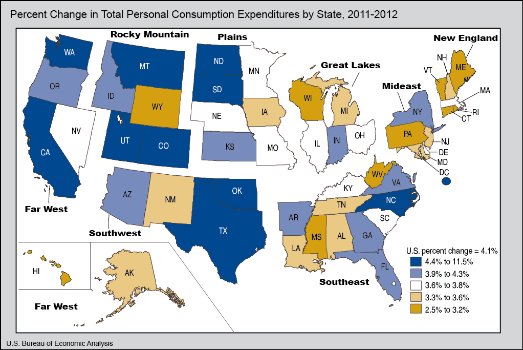 Other states with rapid total PCE growth in 2012 were Texas, the District of Columbia, and Utah. PCE rose at the slowest pace in 2012 in Mississippi. PCE growth in Arizona was closest to the average of all states of 4.1%. Growth in PCE by state reflects both population change and change in per capita expenditures.