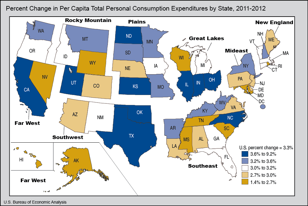 Growth in Total Per Capita Personal Consumption Expenditures. Growth in per capita total PCE between 2011 and 2012 ranged from a high of 9.2% in North Dakota to a low of 1.4% in Wyoming. Across all states, per capita PCE grew 3.3%. The states with the highest growth after North Dakota were Oklahoma, Texas, and Utah, where growth ranged between 4.0% and 4.2%. States with slowest growth after Wyoming were Hawaii, Mississippi, and Nevada.