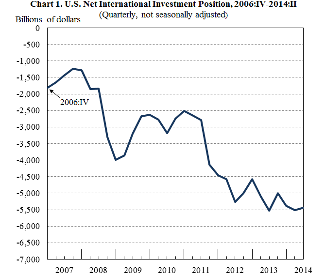 The U.S. net international investment position at the end of the second quarter of 2014 was -$5,445.1 billion (preliminary) as the value of U.S. liabilities exceeded the value of U.S. assets (chart 1, table 1). At the end of the first quarter of 2014, the net position was -$5,511.7 billion (revised). The $66.6 billion increase in the net position reflected a $913.2 billion increase in the value of U.S. assets and an $846.7 billion increase in the value of U.S. liabilities.