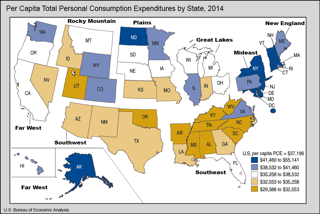 Today, the U.S. Bureau of Economic Analysis released its first set of official statistics on personal consumption expenditures (PCE) by state for 1997-20141. PCE by state – the measure of goods and services purchased by or on behalf of households by state of residence – provides insight into household spending patterns across states and can be used together with other regional data to gain a better understanding of regional economies.