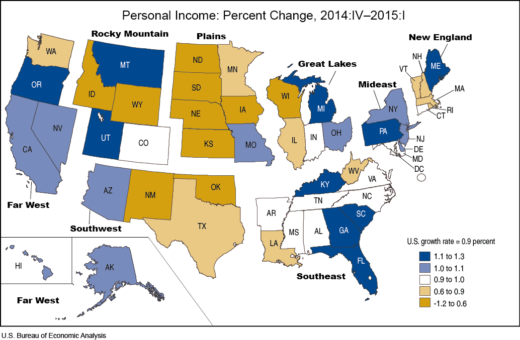 State personal income grew 0.9 percent on average in the first quarter of 2015, after growing 1.1 percent in the fourth quarter of 2014, according to estimates released today by the U.S. Bureau of Economic Analysis. Personal income grew in 46 states and growth accelerated in 15 of those states. The fastest growth, 1.3 percent, was in Florida. Personal income fell in four states, with the largest decline, 1.2 percent, in Iowa. The national price index for personal consumption expenditures, fell 0.5 percent in the first quarter, after falling 0.1 percent in the fourth quarter.