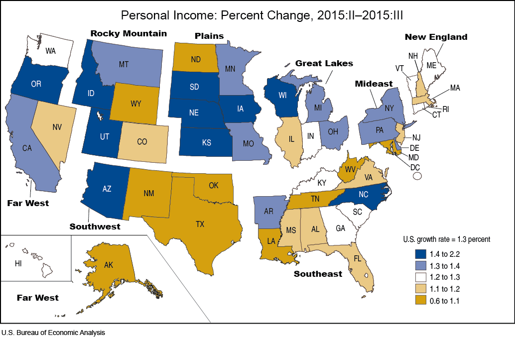 State personal income grew 1.3 percent on average in the third quarter of 2015, the same pace as in the second quarter, according to estimates released today by the U.S. Bureau of Economic Analysis. Personal income grew in every state with third-quarter personal income growth rates ranging from 0.6 percent in Alaska to 2.2 percent in Nebraska and South Dakota (table 1).