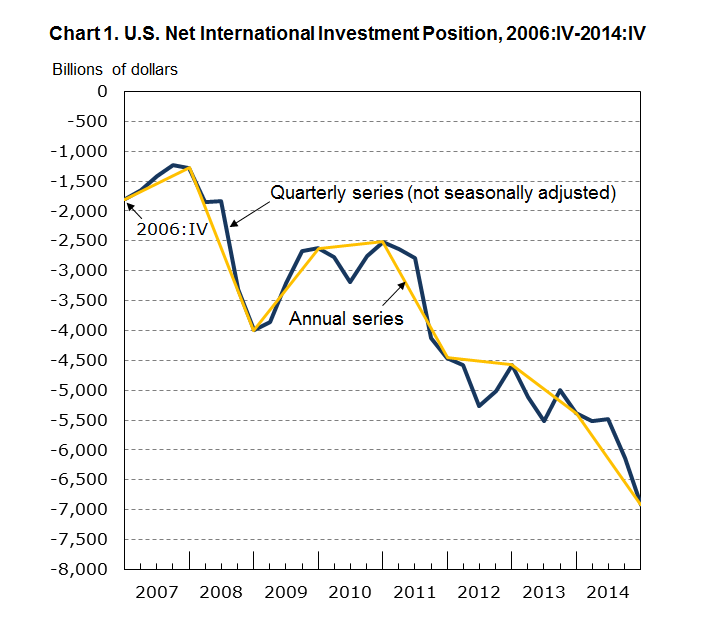 The U.S. net international investment position at the end of the fourth quarter of 2014 was -$6,915.3 billion (preliminary) as the value of U.S. liabilities exceeded the value of U.S. assets (chart 1, table 1). At the end of the third quarter of 2014, the net position was -$6,129.4 billion (revised). The $785.8 billion decrease in the net position reflected an $861.9 billion increase in the value of U.S. liabilities that exceeded a $76.1 billion increase in the value of U.S. assets.