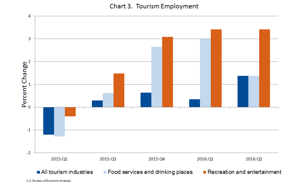 Real spending (output) on travel and tourism accelerated in the second quarter of 2016, increasing at an annual rate of 4.7 percent after increasing 1.2 percent (revised) in the first quarter according to new statistics released by the Bureau of Economic Analysis. By comparison, real gross domestic product (GDP) increased 1.1 percent in the second quarter after increasing 0.8 percent in the first.