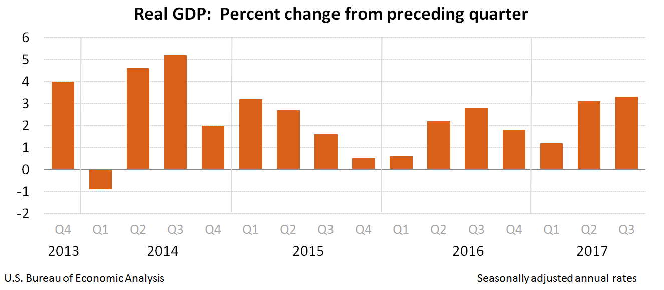 Real gross domestic product (GDP) increased at an annual rate of 3.3 percent in the third quarter of 2017 (table 1), according to the "second" estimate released by the Bureau of Economic Analysis. In the second quarter, real GDP increased 3.1 percent. The GDP estimate released today is based on more complete source data than were available for the "advance" estimate issued last month. In the advance estimate, the increase in real GDP was 3.0 percent. With this second estimate for the third quarter, the general picture of economic growth remains the same; nonresidential fixed investment, state and local government spending, and private inventory investment were revised up from the prior estimate (see "Updates to GDP" on page 2).