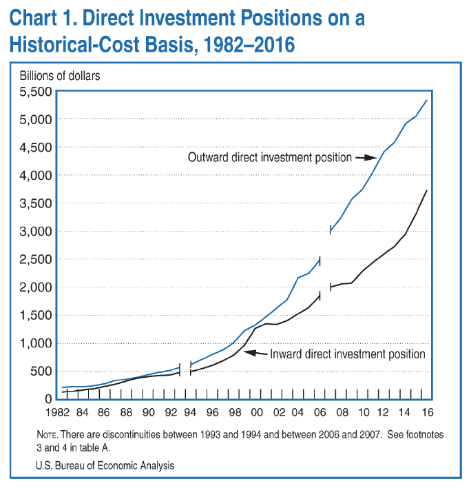 Outward and Inward U.S. foreign direct investment continued to grow in 2016. The U.S. direct investment position abroad valued at historical cost grew 5.6 percent to $5,332.2 billion, compared with an average annual growth rate of 8.2 percent in 2006–2015. The foreign direct investment position in the United States valued at historical cost grew 12.8 percent to $3,725.4 billion, compared with an average annual growth rate of 6.7 percent in 2006–2015.