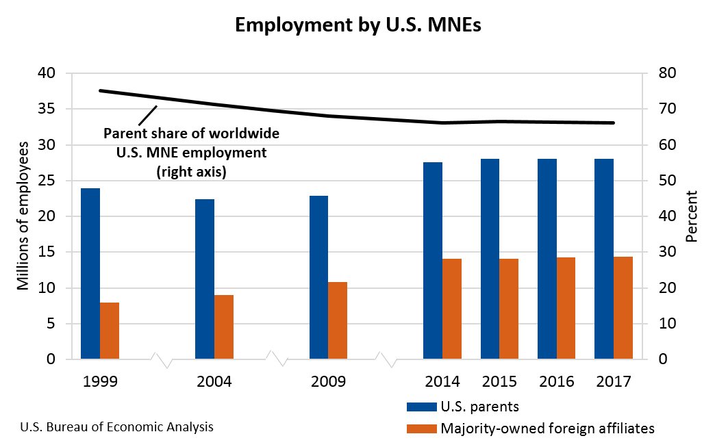 Employment in the United States by U.S. parents increased 0.2 percent to 28.1 million workers in 2017. U.S. parents accounted for 66.1 percent of worldwide employment by U.S. MNEs, down from 66.3 percent in 2016. Employment abroad by majority-owned foreign affiliates (MOFAs) of U.S. MNEs increased 0.9 percent to 14.4 million workers and accounted for 33.9 percent of employment by U.S. MNEs worldwide.