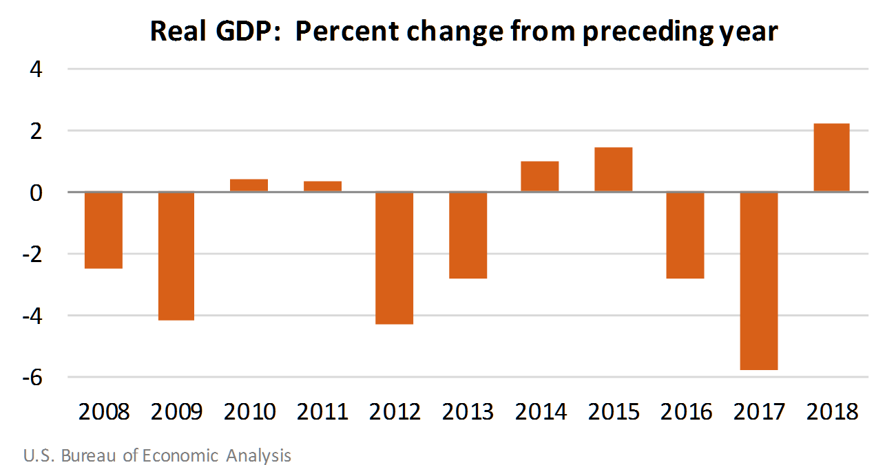 The estimates of GDP for American Samoa show that real GDP—GDP adjusted to remove price changes—increased 2.2 percent in 2018 after decreasing 5.8 percent in 2017 (see Table 1.3). For comparison, real GDP for the United States (excluding the territories) increased 2.9 percent in 2018 after increasing 2.4 percent in 2017.