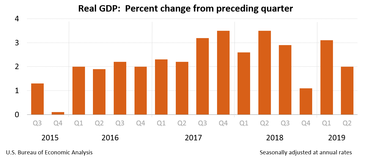 Real gross domestic product (GDP) increased at an annual rate of 2.0 percent in the second quarter of 2019 (table 1), according to the "third" estimate released by the Bureau of Economic Analysis. In the first quarter, real GDP increased 3.1 percent.
