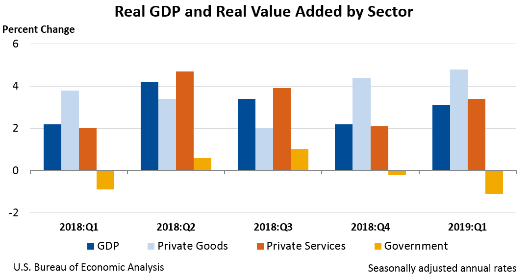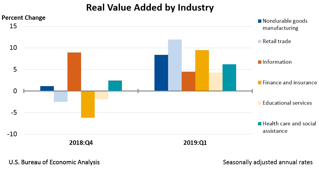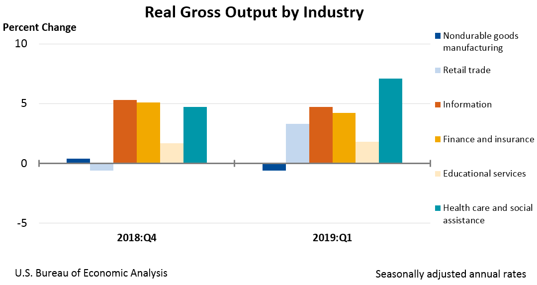 Finance and insurance; retail trade; and health care and social assistance were the leading contributors to the increase in U.S. economic growth in the first quarter of 2019. According to gross domestic product (GDP) by industry statistics released by the Bureau of Economic Analysis, 16 of 22 industry groups contributed to the overall 3.1 percent increase in real GDP in the first quarter.