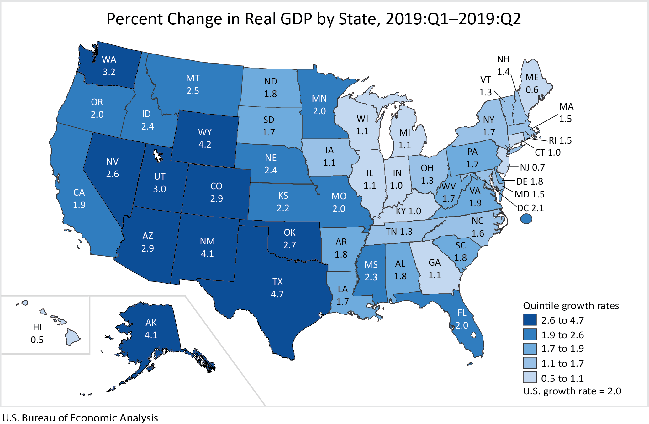 Real gross domestic product (GDP) increased in all 50 states and the District of Columbia in the second quarter of 2019, according to statistics released today by the U.S. Bureau of Economic Analysis. The percent change in real GDP in the second quarter ranged from 4.7 percent in Texas to 0.5 percent in Hawaii (table 1).