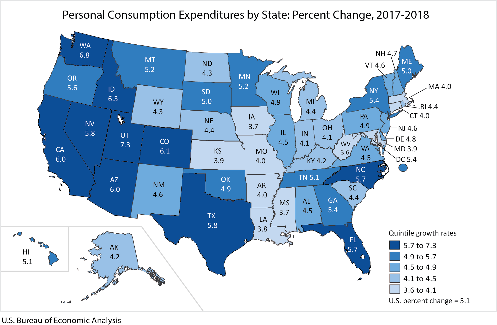 State personal consumption expenditures (PCE) increased 5.1 percent in 2018, an acceleration from the 4.4 percent increase in 2017 (table 1), according to statistics released today by the Bureau of Economic Analysis. The percent change in PCE across all states ranged from 7.3 percent in Utah to 3.6 percent in West Virginia.