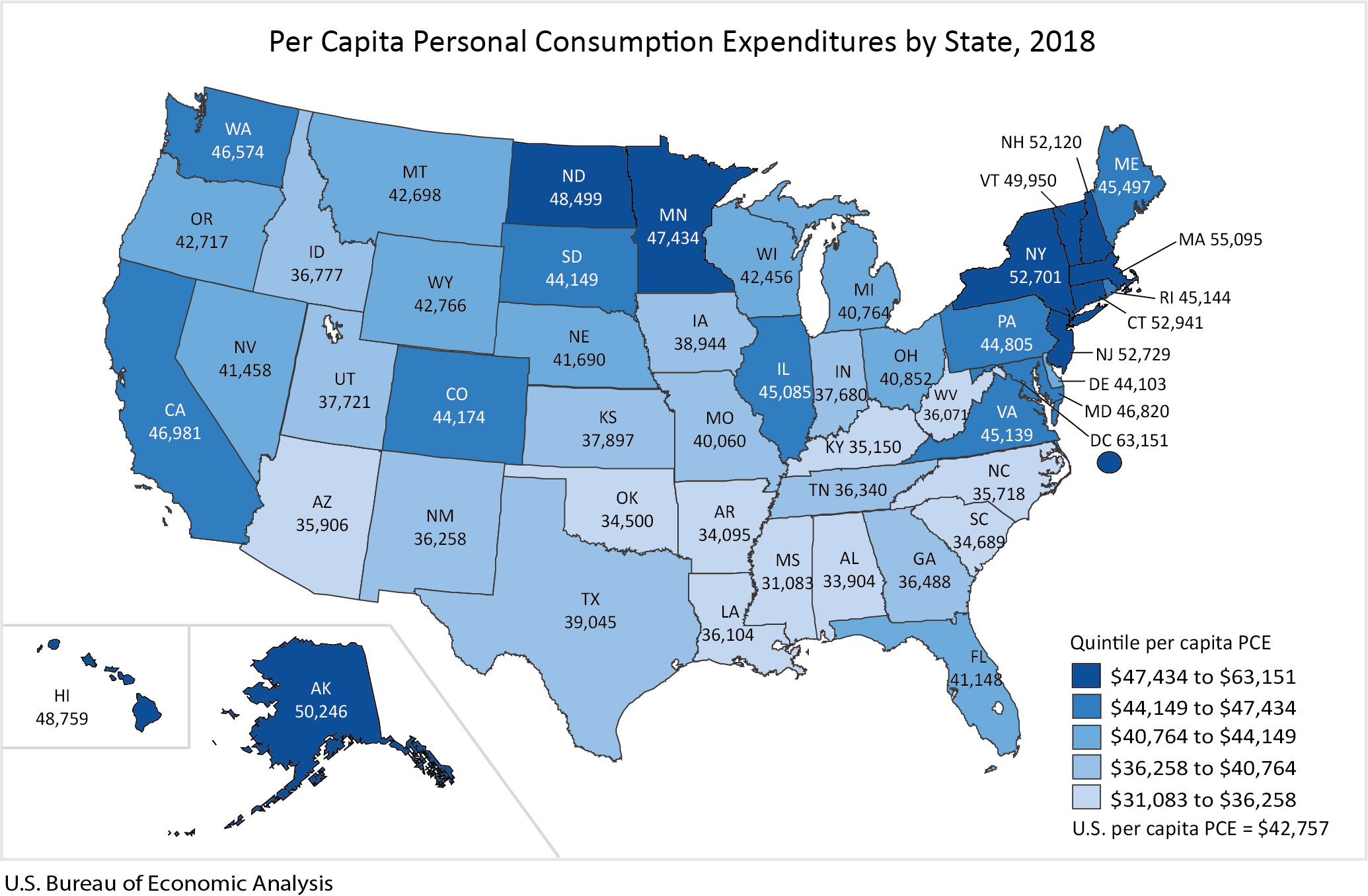 Across all states and the District of Columbia, per capita PCE was $42,757 (table 4). Per capita PCE by state ranged from a high of $55,095 in Massachusetts to a low of $31,083 in Mississippi. Per capita PCE in the District of Columbia was $63,151.