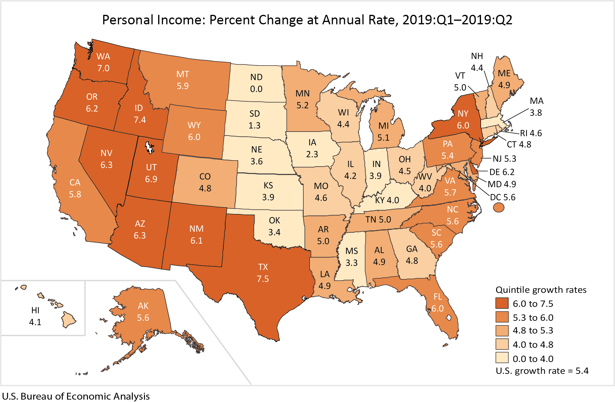 State personal income increased 5.4 percent at an annual rate in the second quarter of 2019, a deceleration from the 6.2 percent increase in the first quarter, according to estimates released today by the Bureau of Economic Analysis (table 1). The percent change in personal income across all states ranged from 7.5 percent in Texas to unchanged in North Dakota.