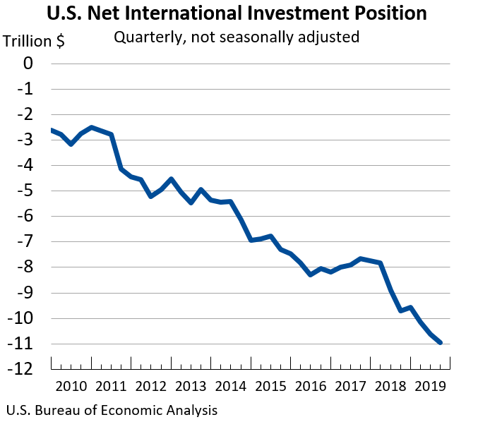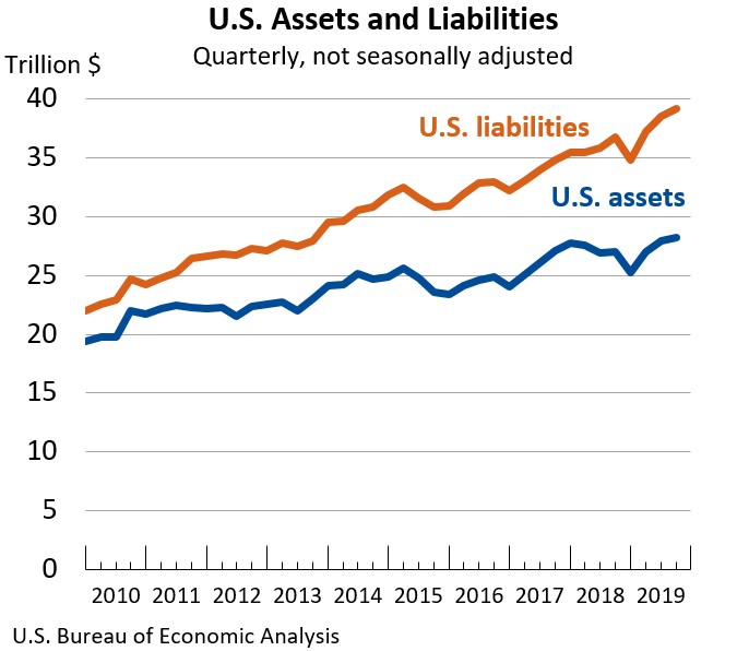 The U.S. net international investment position, the difference between U.S. residents’ foreign financial assets and liabilities, was –$10.95 trillion at the end of the third quarter of 2019, according to statistics released by the U.S. Bureau of Economic Analysis (BEA). Assets totaled $28.26 trillion and liabilities were $39.21 trillion.