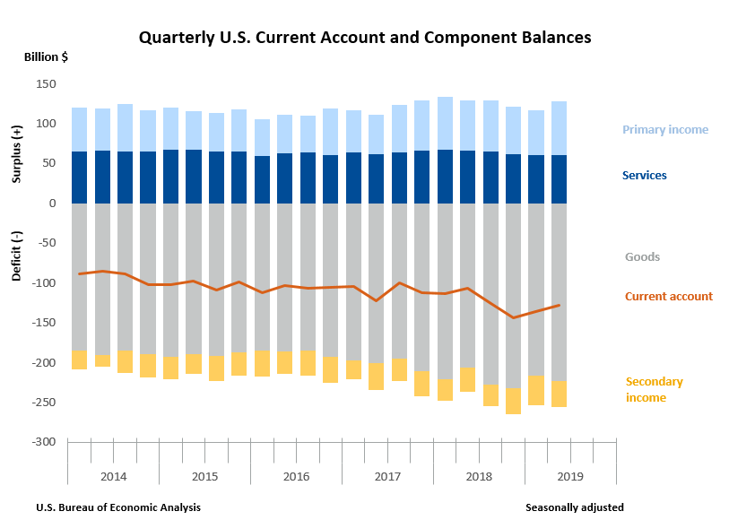The U.S. current account deficit, which reflects the combined balances on trade in goods and services and income flows between U.S. residents and residents of other countries, narrowed by $8.0 billion, or 5.9 percent, to $128.2 billion in the second quarter of 2019, according to statistics from the U.S. Bureau of Economic Analysis (BEA). The revised first quarter deficit was $136.2 billion.