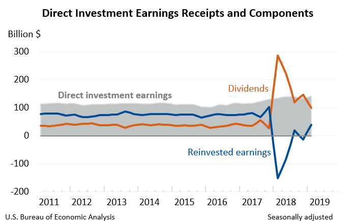 In the international transactions accounts, income on equity, or earnings, of foreign affiliates of U.S. multinational enterprises consists of a portion that is repatriated to the parent company in the United States in the form of dividends and a portion that is reinvested in foreign affiliates. In response to the 2017 Tax Cuts and Jobs Act, which generally eliminated taxes on repatriated earnings, some U.S. multinational enterprises repatriated accumulated prior earnings of their foreign affiliates. In the first, second, and fourth quarters of 2018, the repatriation of dividends exceeded current-period earnings, resulting in negative values being recorded for reinvested earnings. In the first quarter of 2019, dividends were $100.2 billion while reinvested earnings were $40.2 billion (see table below). The reinvested earnings are also reflected in the net acquisition of direct investment assets in the financial account (table 6). For more information, see "How does the 2017 Tax Cuts and Jobs Act affect BEA’s business income statistics?" and "How are the international transactions accounts affected by an increase in direct investment dividend receipts?"
