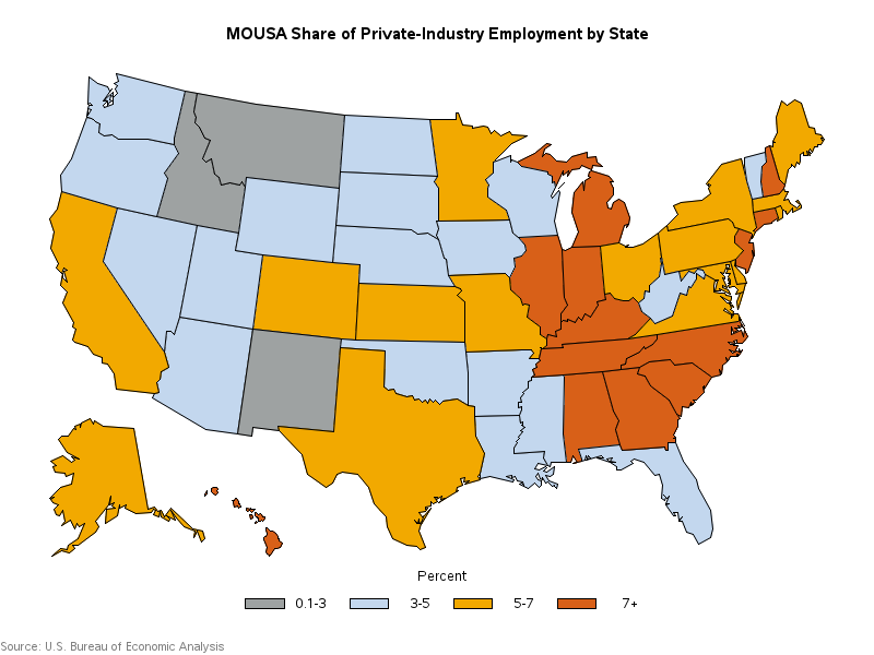 By state, private-industry employment accounted for by MOUSAs was highest in South Carolina (8.8 percent), Kentucky (8.4 percent), and Michigan (8.2 percent). In all three states, MOUSAs in the manufacturing industry employed the most workers.