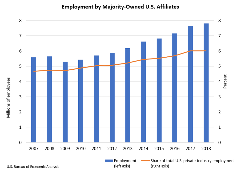 Majority-owned U.S. affiliates (MOUSAs) of foreign multinational enterprises (MNEs) employed 7.8 million workers in the United States in 2018, a 1.9 percent increase from 7.7 million in 2017, according to statistics on MOUSA operations and finances released by the Bureau of Economic Analysis.